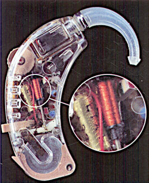 Die T-Spule im Hörgerät. Die dargestellte T-Spule ist nicht einmal besonders klein.